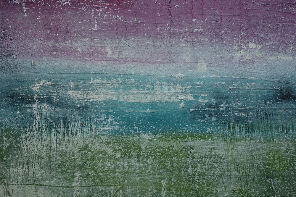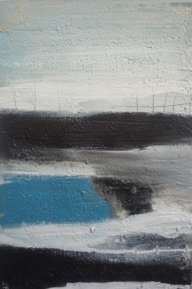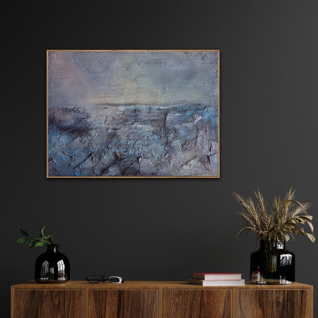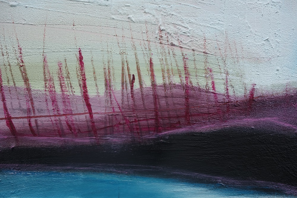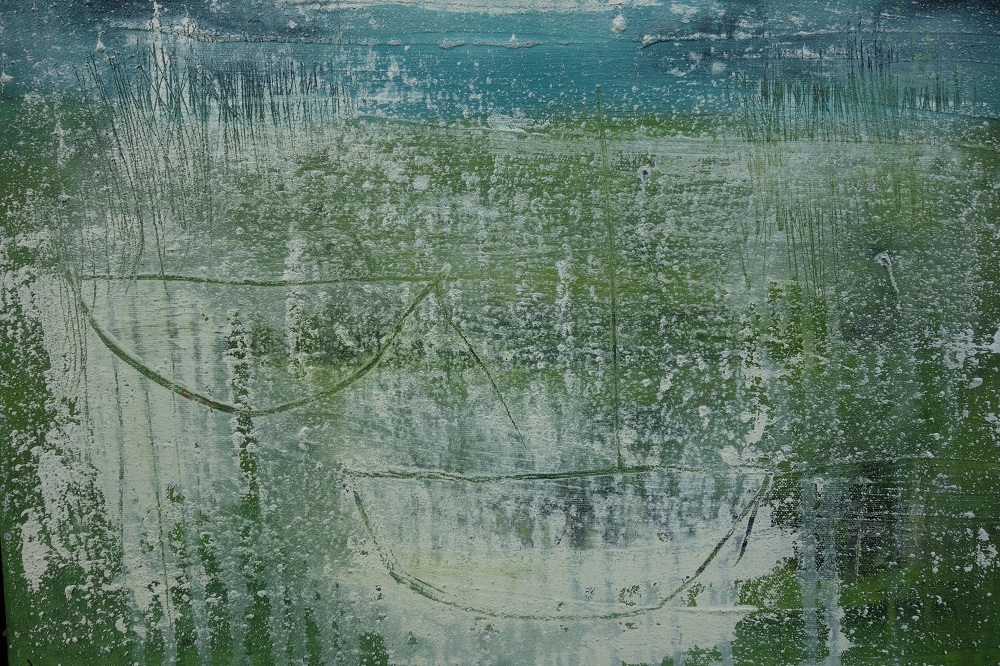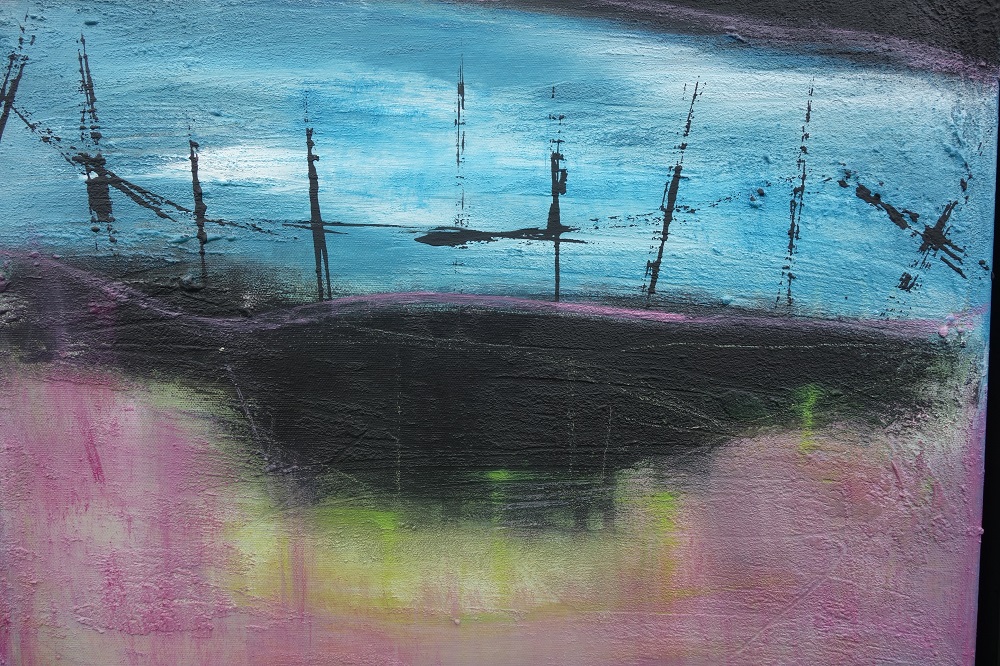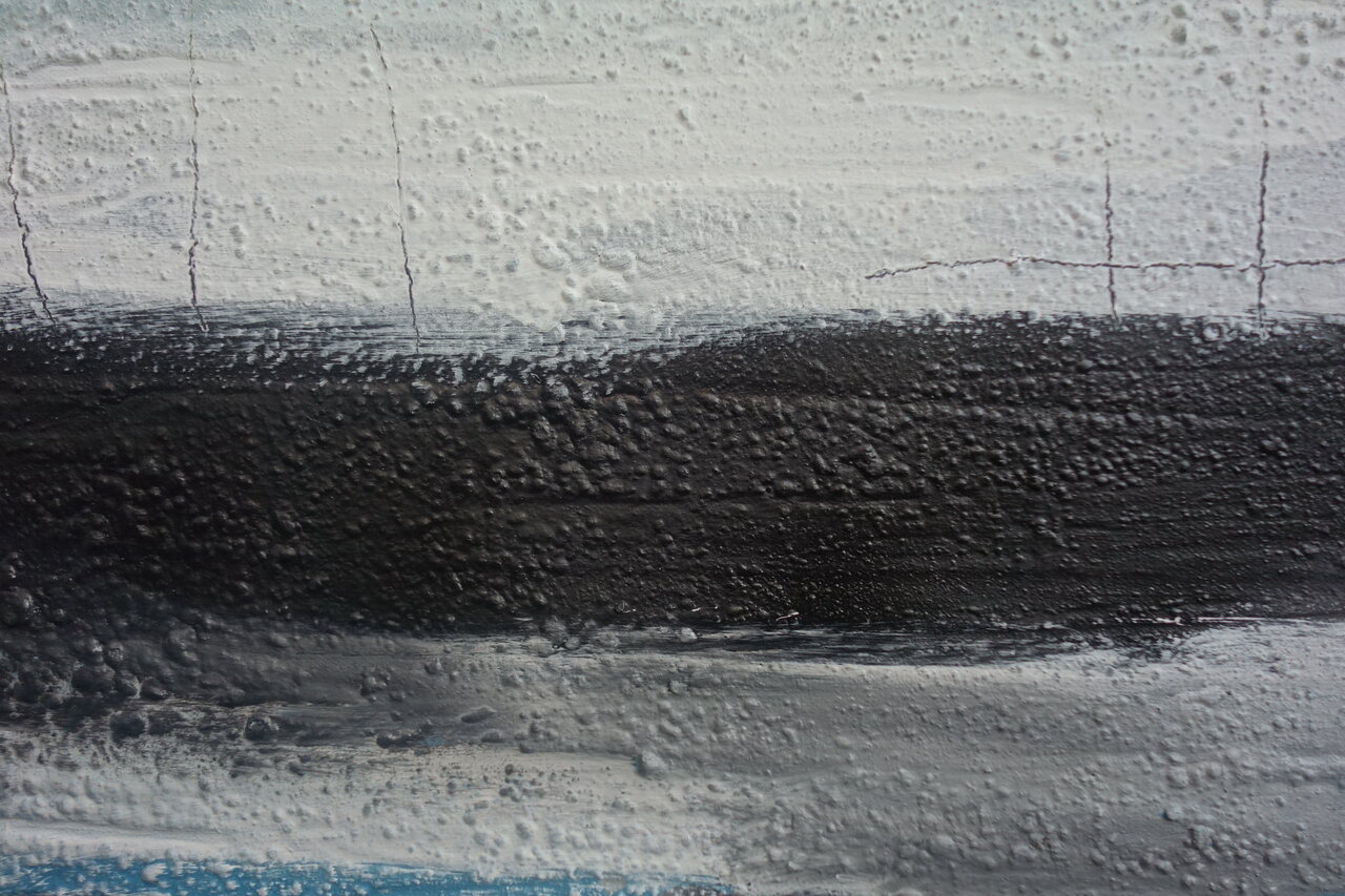 Das abstrakte Werk zeigt eine ruhige, fast meditative Szene aus Wasser, Zaun und Horizont. Mit Spachtel gezogene Linien und strukturierte Flächen erzeugen Tiefe und Bewegung. Trotz der Schlichtheit regt das Bild zum Nachdenken über Grenzen, Trennung und Verbindung an – über das, was uns teilt, und das, was uns verbindet. Es lädt dazu ein, innezuhalten und den eigenen Blick auf Freiheit, Abgrenzung und Übergänge zu hinterfragen.
