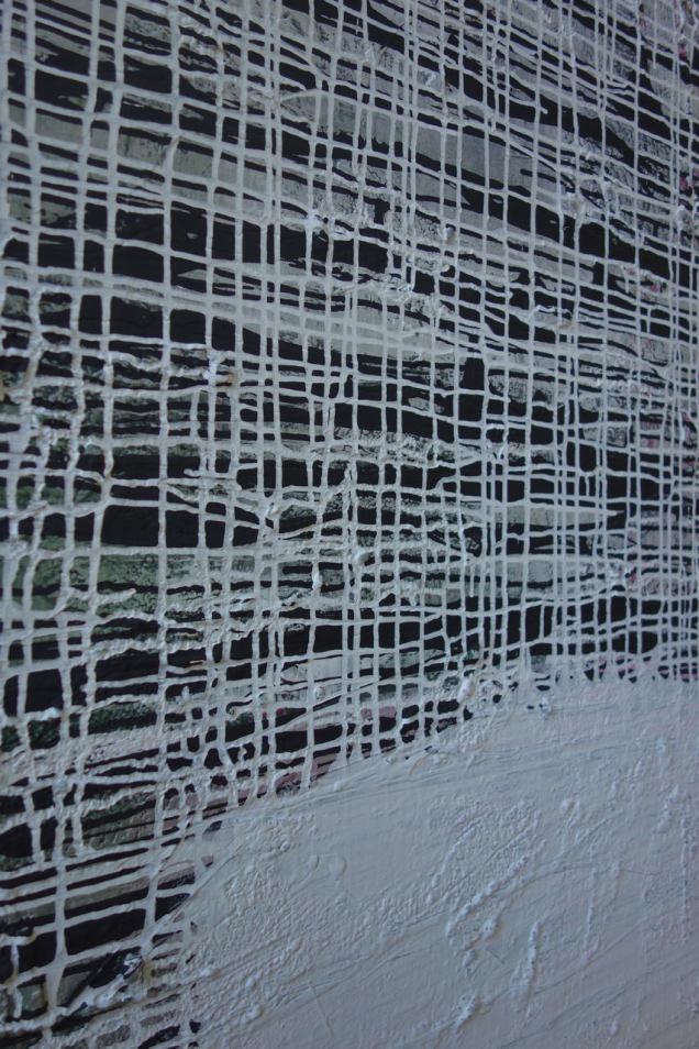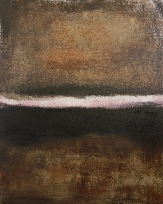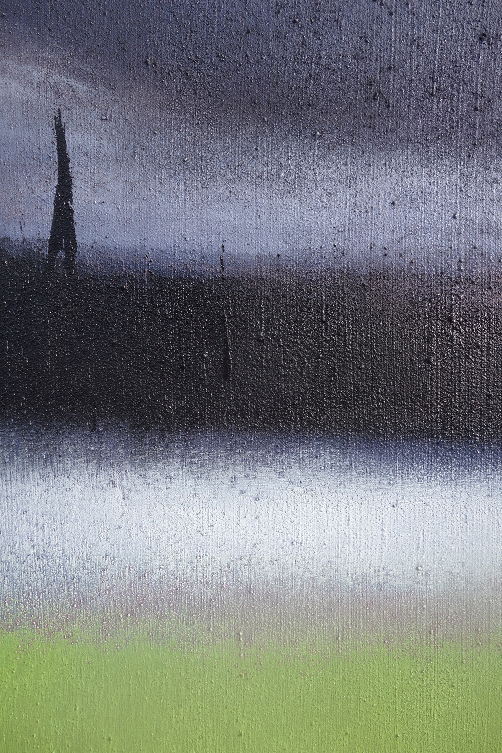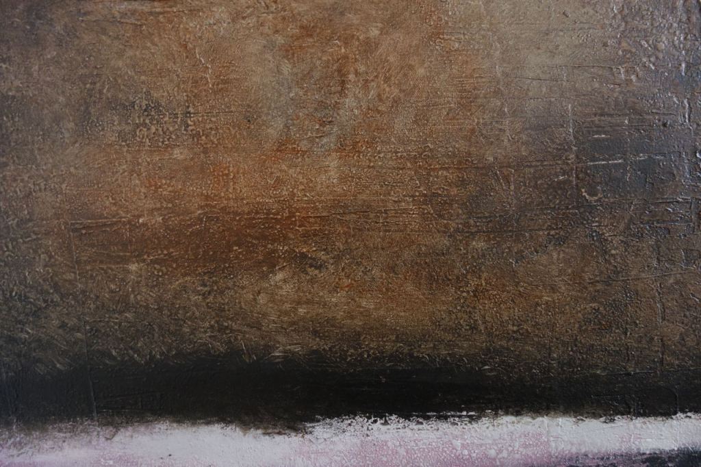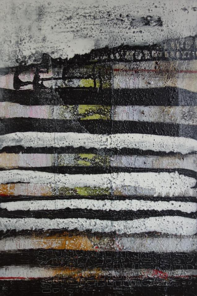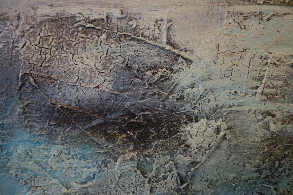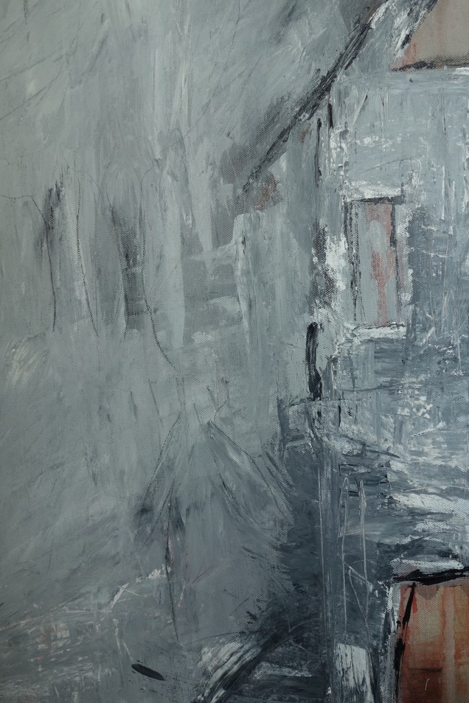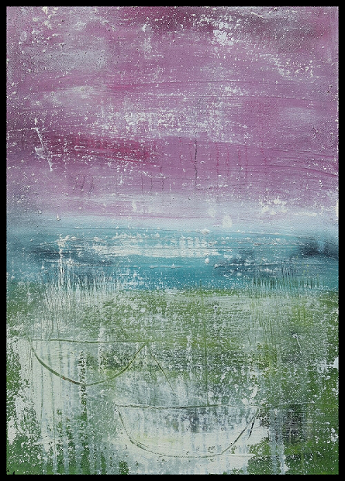 Das abstrakte Werk zeigt eine ruhige, fast meditative Szene aus Wasser, Zaun und Horizont. Mit Spachtel gezogene Linien und strukturierte Flächen erzeugen Tiefe und Bewegung. Trotz der Schlichtheit regt das Bild zum Nachdenken über Grenzen, Trennung und Verbindung an – über das, was uns teilt, und das, was uns verbindet. Es lädt dazu ein, innezuhalten und den eigenen Blick auf Freiheit, Abgrenzung und Übergänge zu hinterfragen.