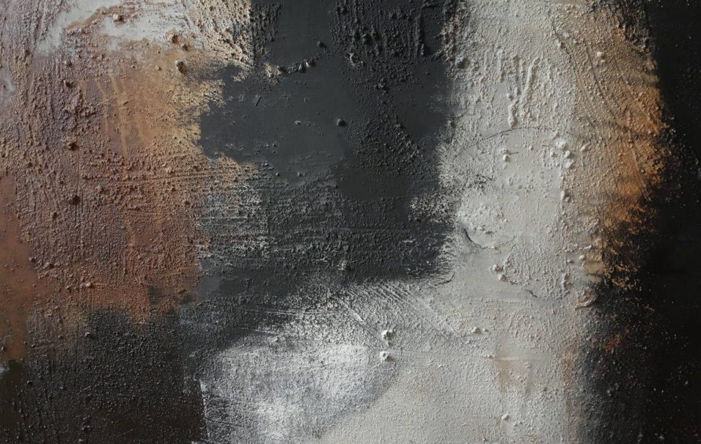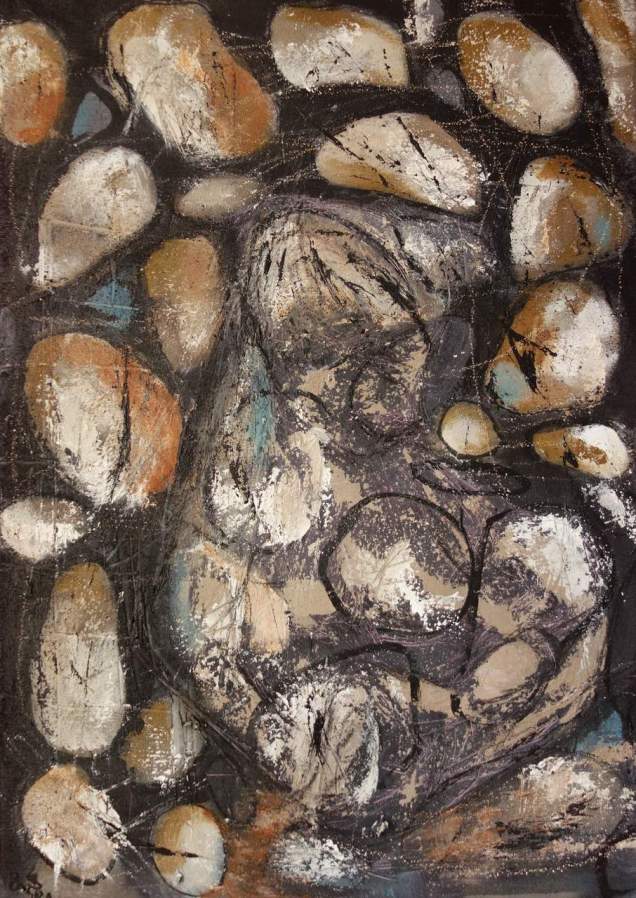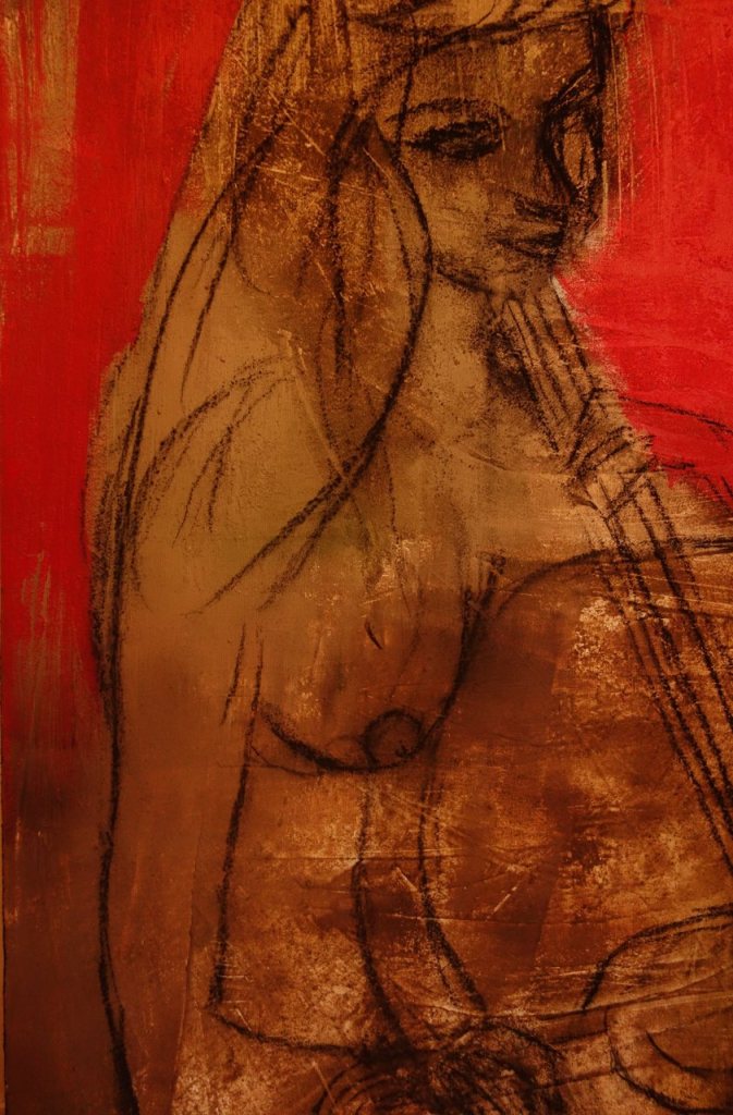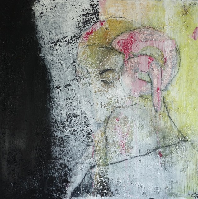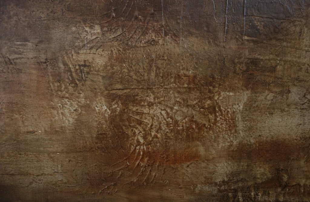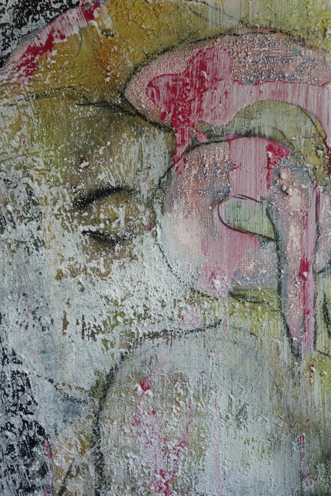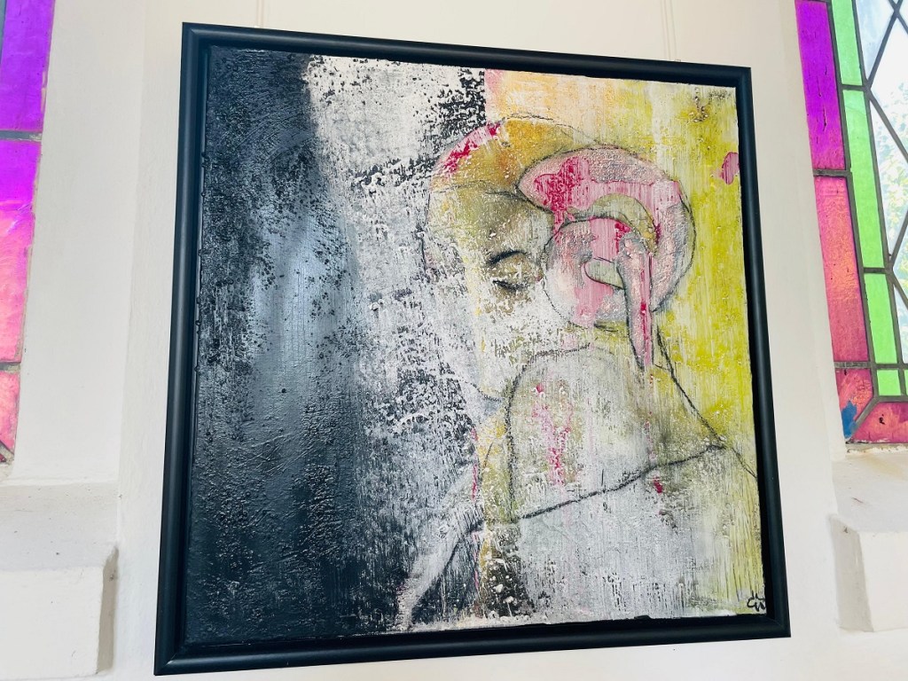Doch wenn man genauer hinschaut, erkennt man zwei Figuren – umgeben von warmen Erdtönen: eine Mutter mit ihrem Säugling im Arm.