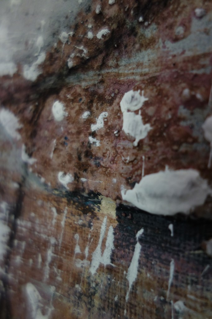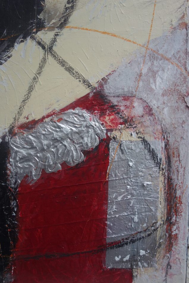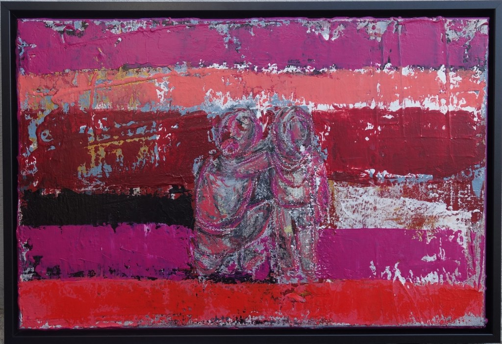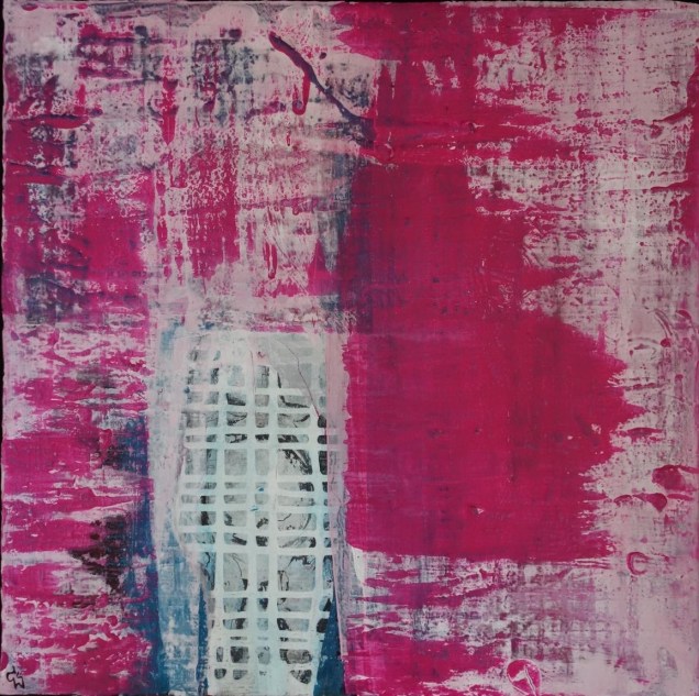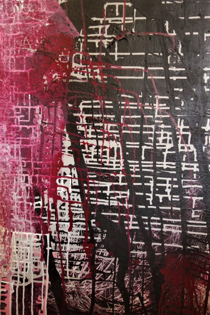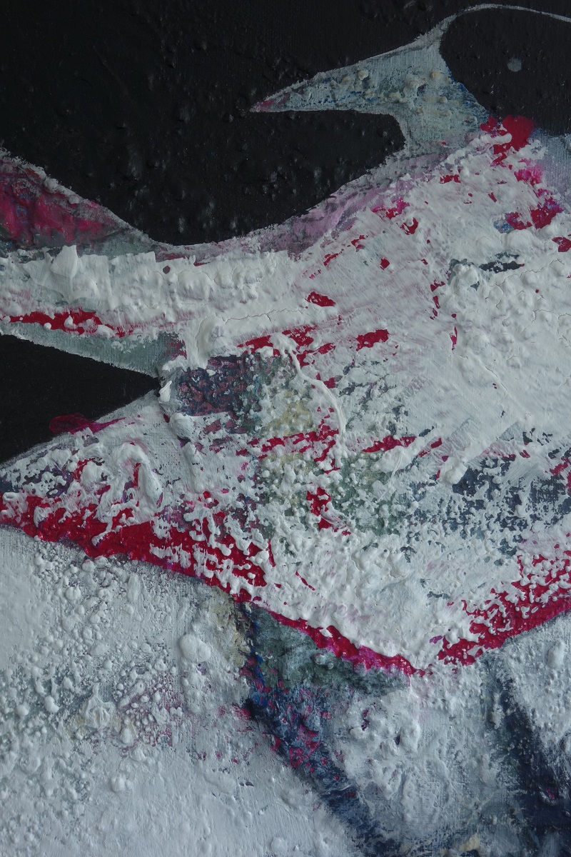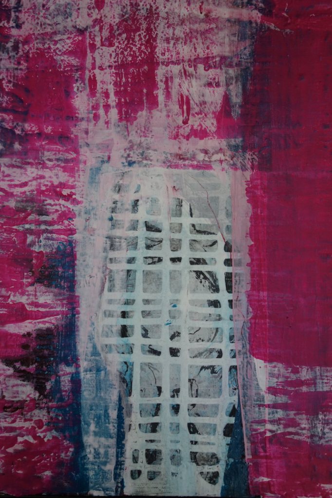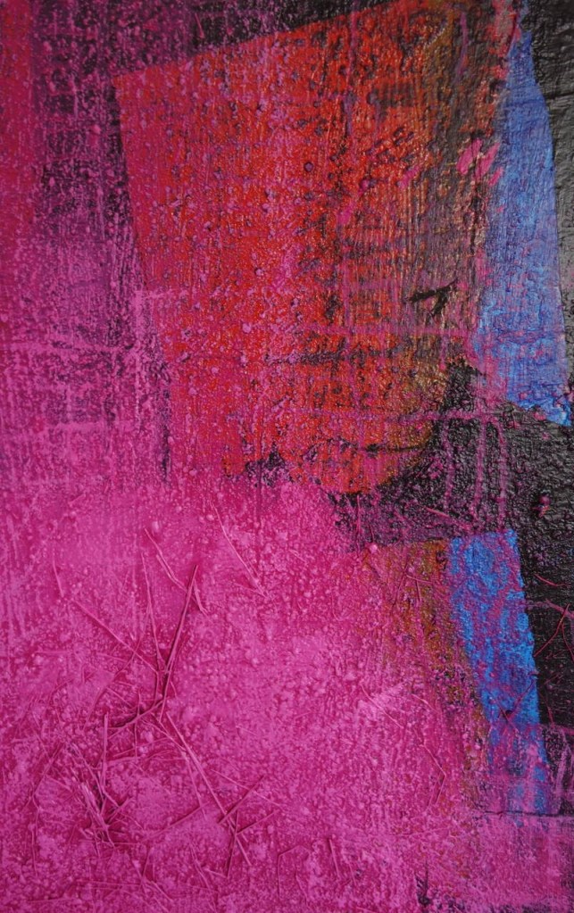Abstraktes Acrylgemälde in intensiven Magenta-, Blau- und Rottönen. Verschiedene Materialien wurden in die Farbflächen eingearbeitet, wodurch die Oberfläche eine spürbare Unebenheit erhält. Im oberen rechten Bereich ist schemenhaft eine Figur zu erkennen, die an einen „Strauchdieb“ erinnert.
