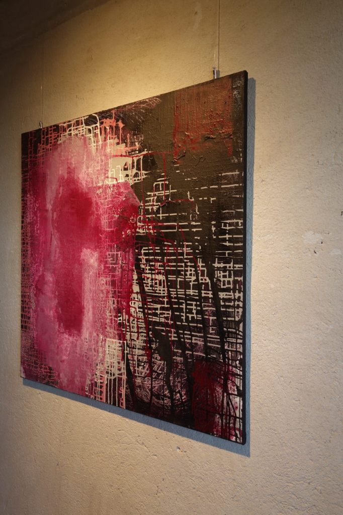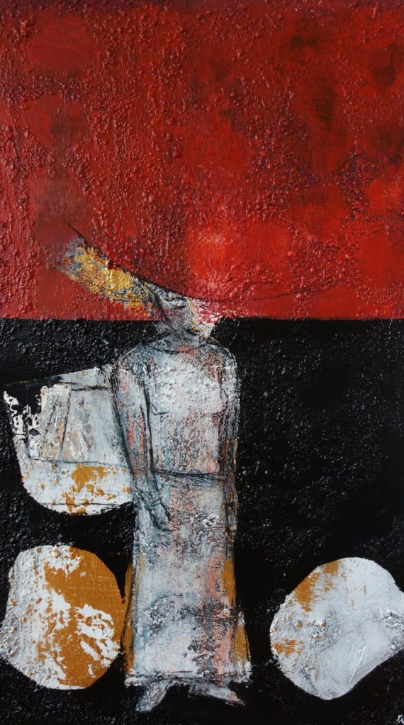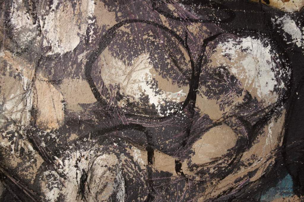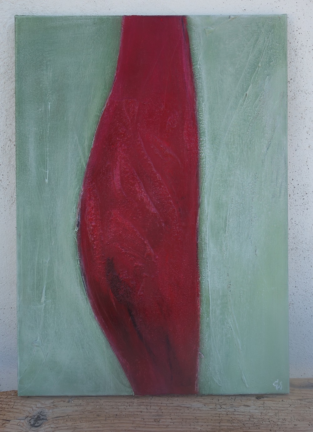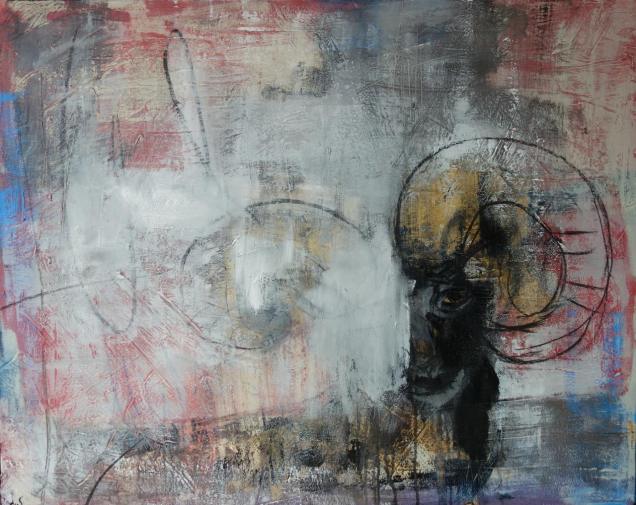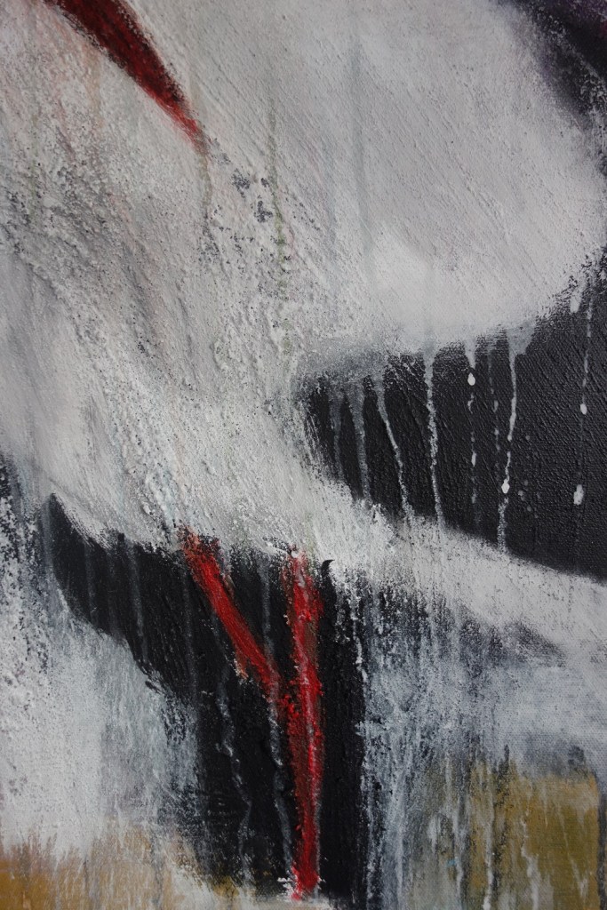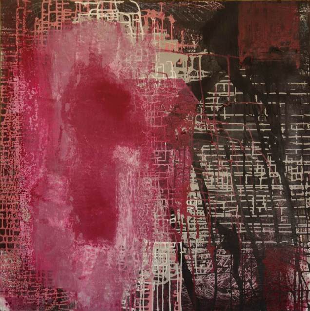 Abstraktes Acrylgemälde in intensiven Magenta-, Blau- und Rottönen. Verschiedene Materialien wurden in die Farbflächen eingearbeitet, wodurch die Oberfläche eine spürbare Unebenheit erhält. Im oberen rechten Bereich ist schemenhaft eine Figur zu erkennen, die an einen „Strauchdieb“ erinnert.