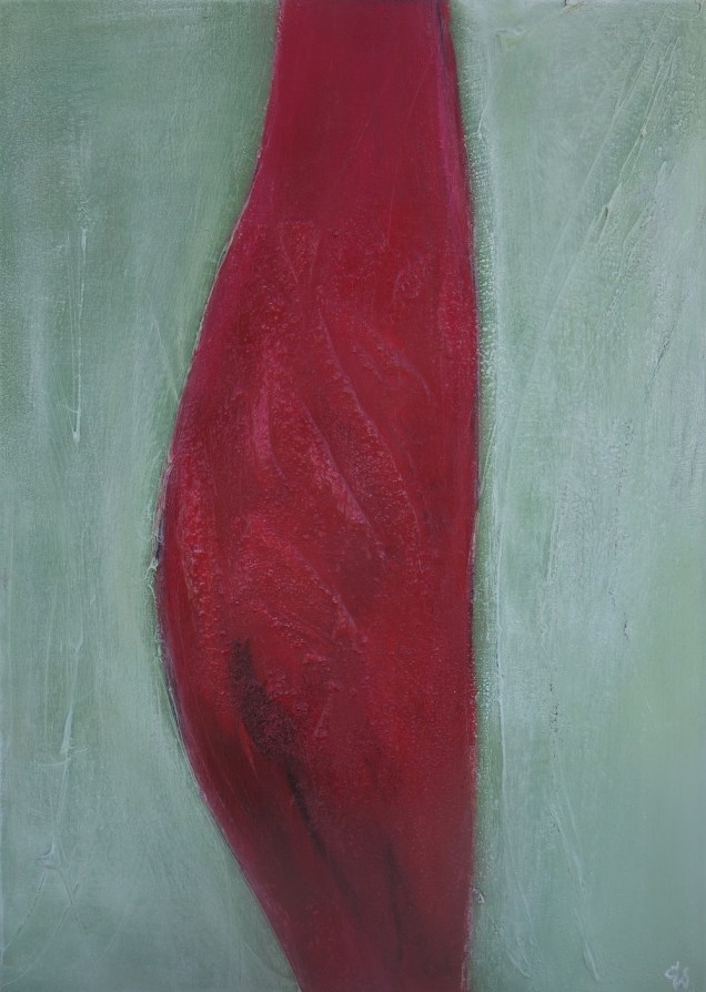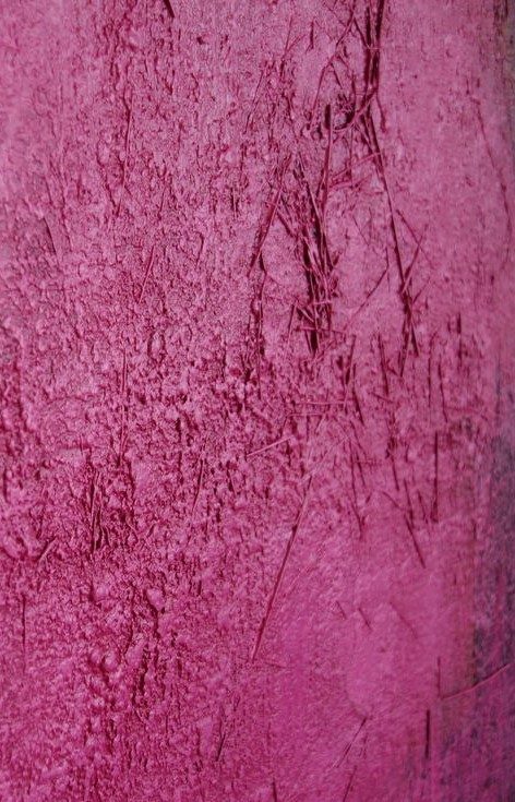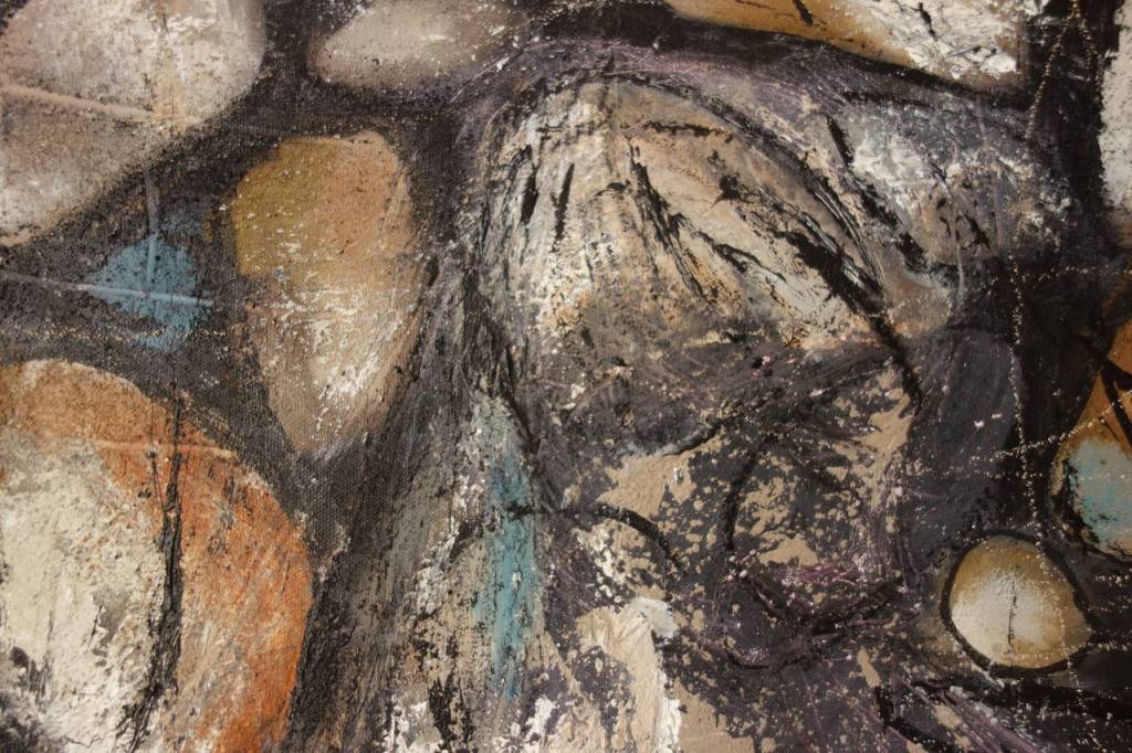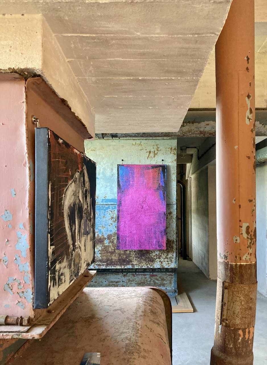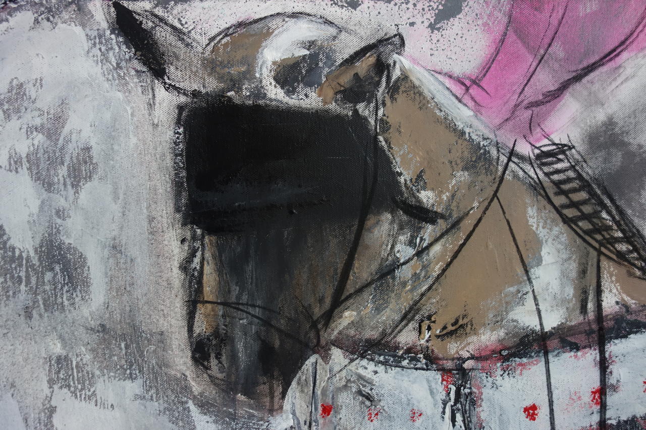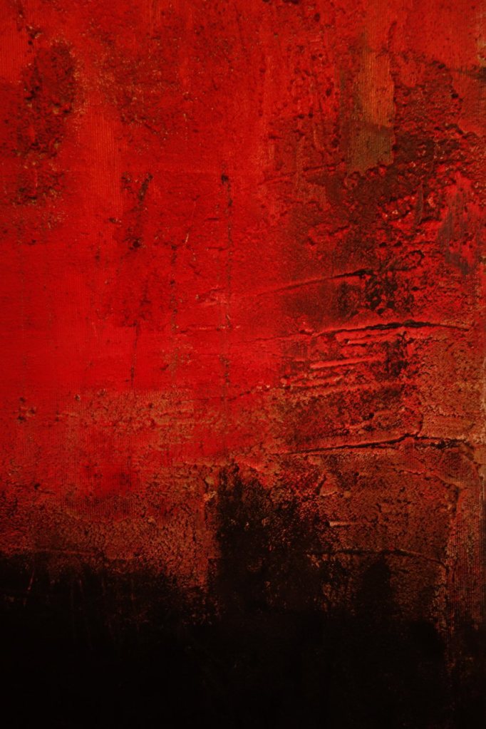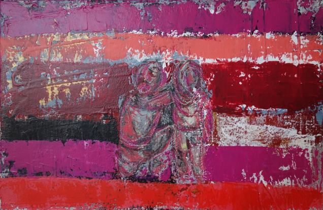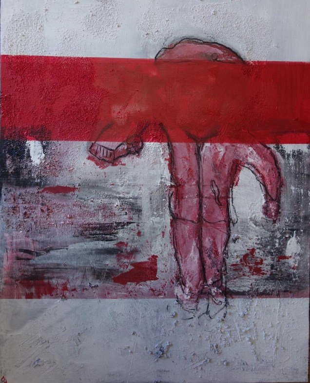 Abstraktes Acrylgemälde in intensiven Magenta-, Blau- und Rottönen. Verschiedene Materialien wurden in die Farbflächen eingearbeitet, wodurch die Oberfläche eine spürbare Unebenheit erhält. Im oberen rechten Bereich ist schemenhaft eine Figur zu erkennen, die an einen „Strauchdieb“ erinnert.