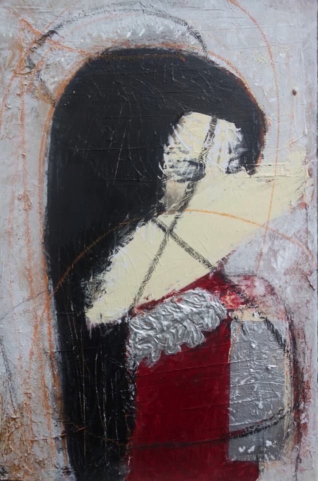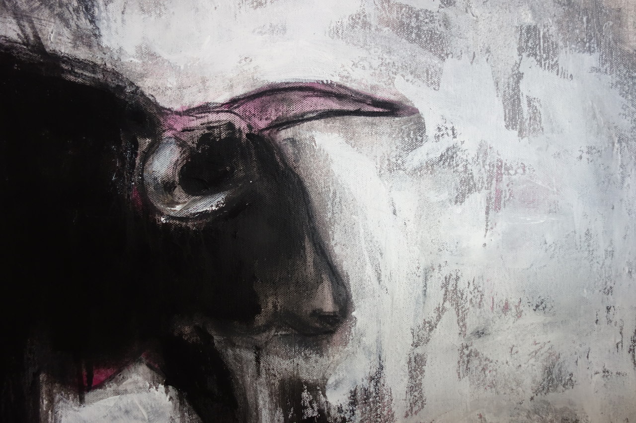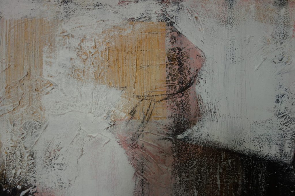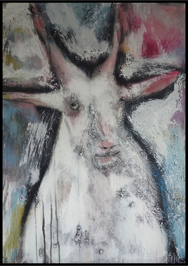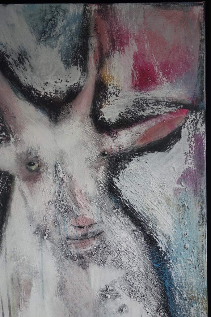 Das Acrylgemälde zeigt eine Frau mit geschlossenen Augen und markanten Hörnern auf dem Kopf. Ihre Haltung wirkt ruhig und in sich gekehrt. Der Hintergrund ist in zwei kontrastreiche Hälften geteilt: links tiefes Schwarz mit sichtbaren Strukturen, rechts helle Weiß- und Goldgelbtöne, die Wärme und Leichtigkeit ausstrahlen. Die freie Schulter der Frau betont zugleich Verletzlichkeit und Stärke – daher der Titel „Schulterfrei“. Das Werk spielt mit Gegensätzen wie Dunkelheit und Licht, Kraft und Sanftheit, Innerlichkeit und Ausdruck.