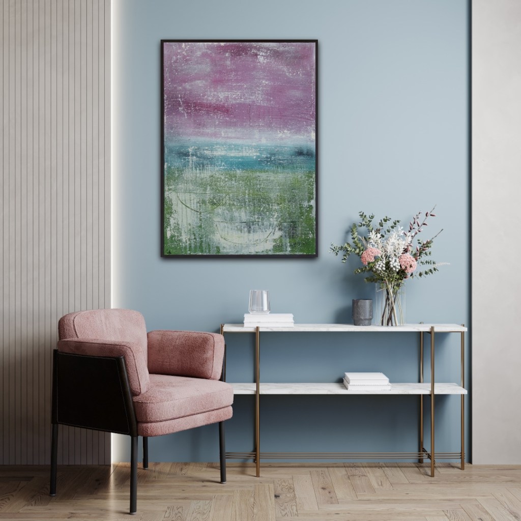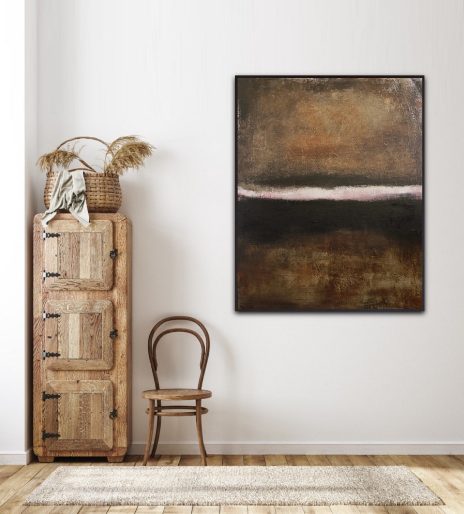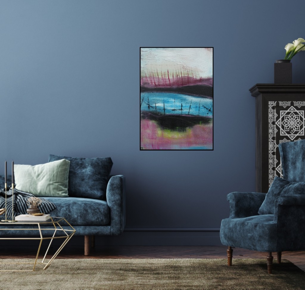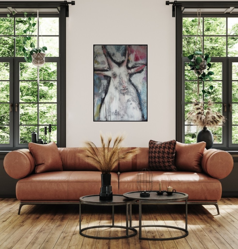 Bitte beachte: Die Bilder, die virtuell in Wohnräume eingefügt sind, dienen lediglich als Beispiel, um zu zeigen, wie die Kunstwerke im Raum wirken können – gegebenenfalls auch mit Zierrahmen.